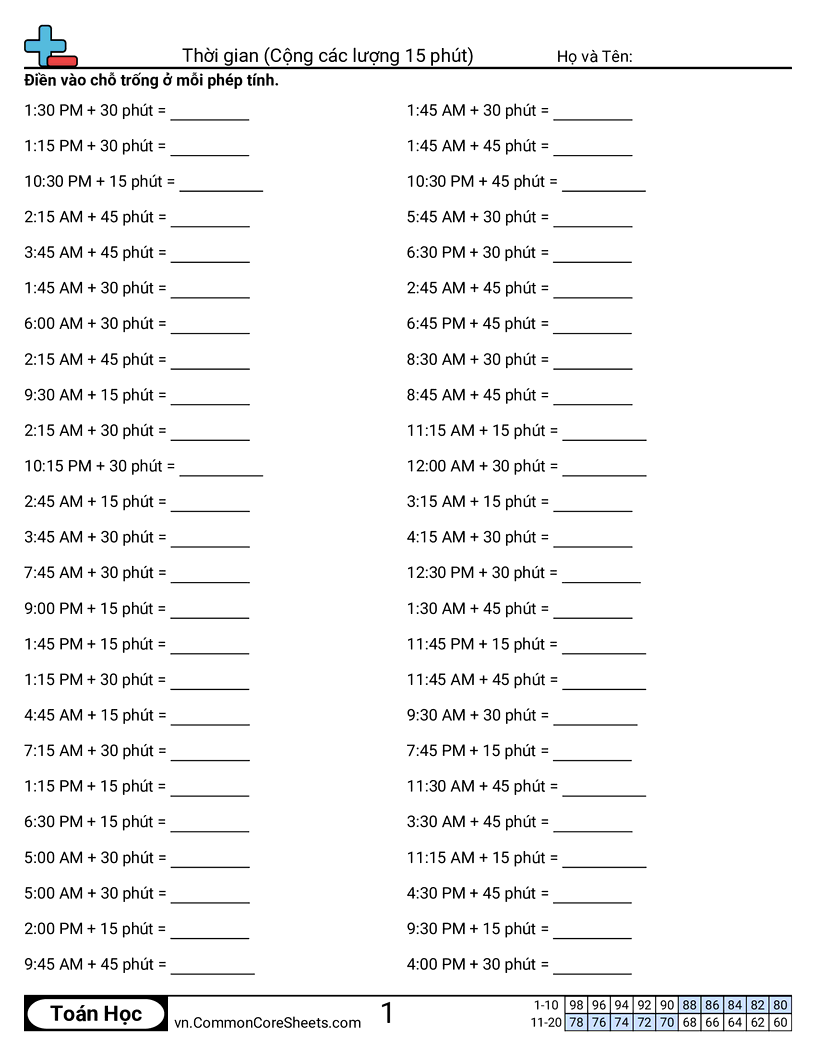 Phiếu bài tập math miễn phí về Thời gian (Cộng các lượng 15 phút). Mỗi phiếu có 50 bài tập kèm đáp án và phù hợp cho giáo viên và học tại nhà. Bạn có thể tải PDF, tạo thẻ ghi nhớ hoặc dùng cho học trực tuyến.