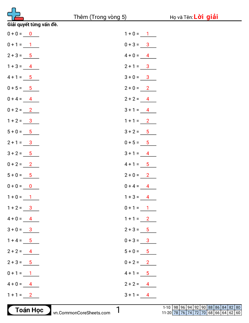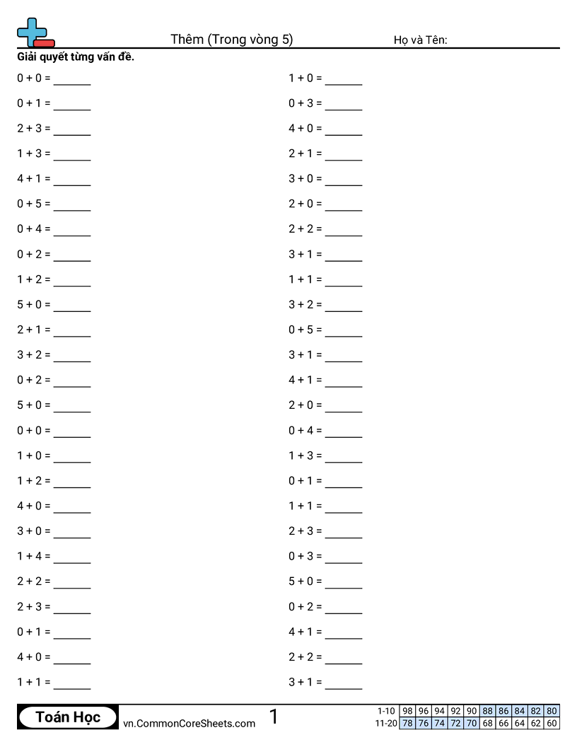 Phiếu bài tập math miễn phí cho Mẫu giáo (koa5) về Thêm (Trong vòng 5) . Mỗi phiếu có 50 bài tập kèm đáp án và phù hợp cho giáo viên và học tại nhà. Bạn có thể tải PDF, tạo thẻ ghi nhớ hoặc dùng cho học trực tuyến.