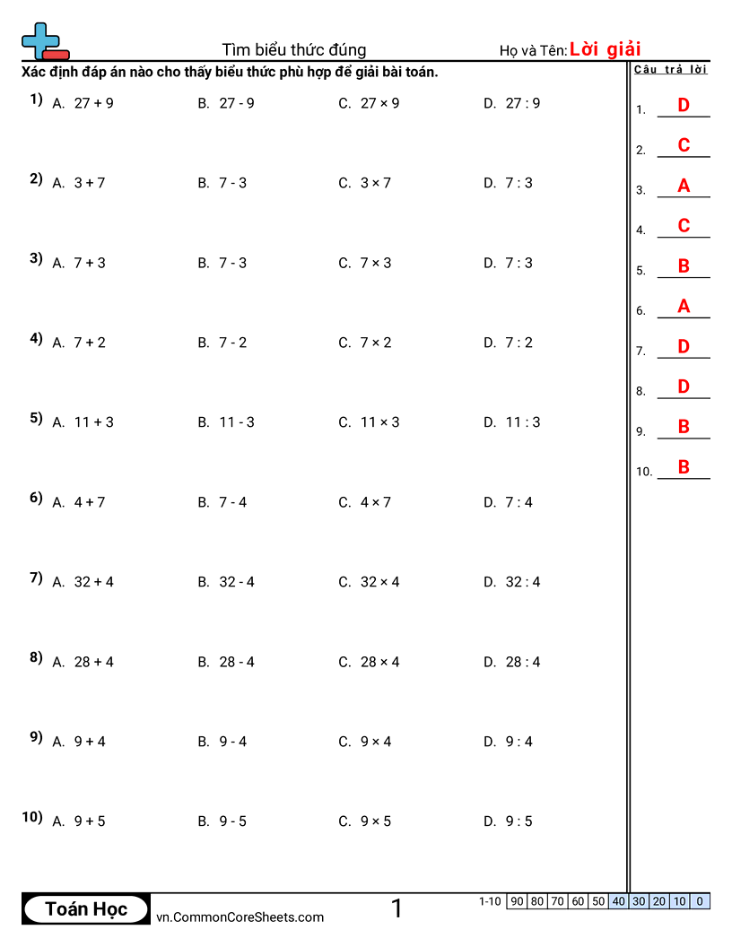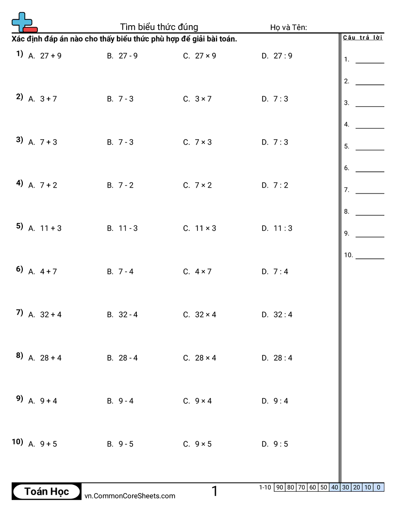 Mỗi trang có 10 bài toán xác định biểu thức nào là phù hợp để giải bài toán.