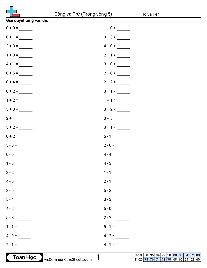 Phiếu bài tập math miễn phí cho Mẫu giáo (koa5) về Cộng và Trừ (Trong vòng 5) . Mỗi phiếu có 50 bài tập kèm đáp án và phù hợp cho giáo viên và học tại nhà. Bạn có thể tải PDF, tạo thẻ ghi nhớ hoặc dùng cho học trực tuyến.