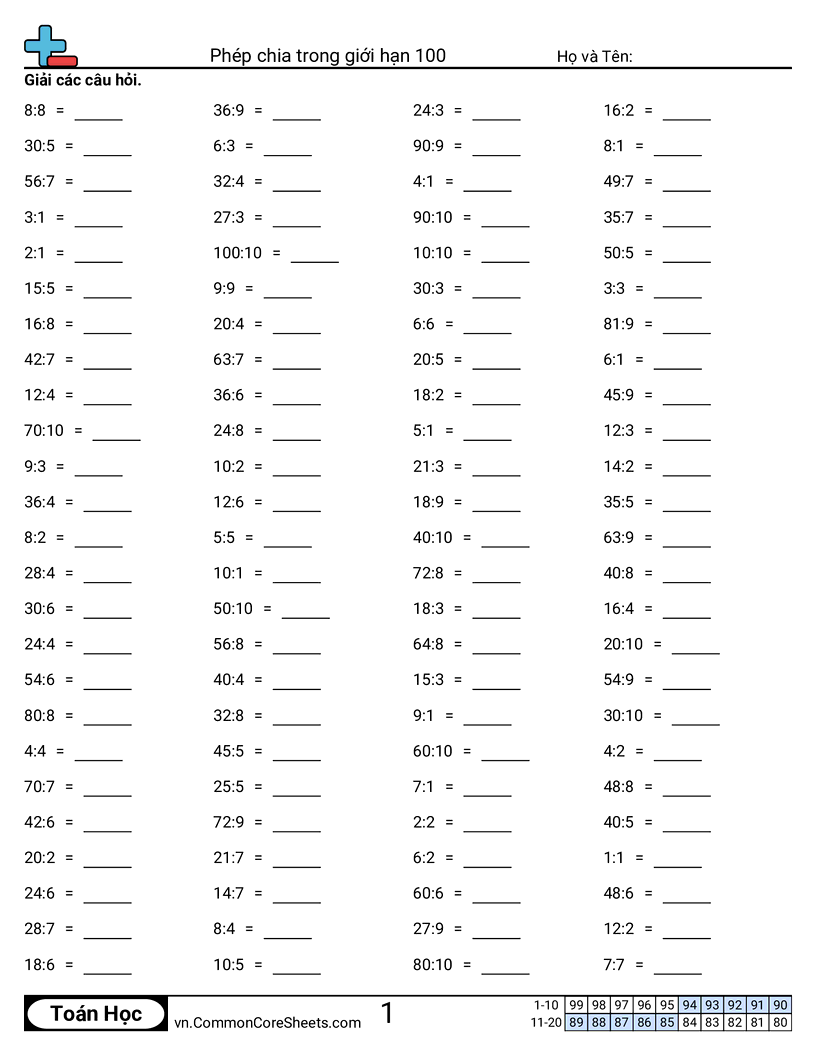 Mỗi bảng có 100 phép tính chia từ 10 ÷ 10 đến 1 ÷ 1.