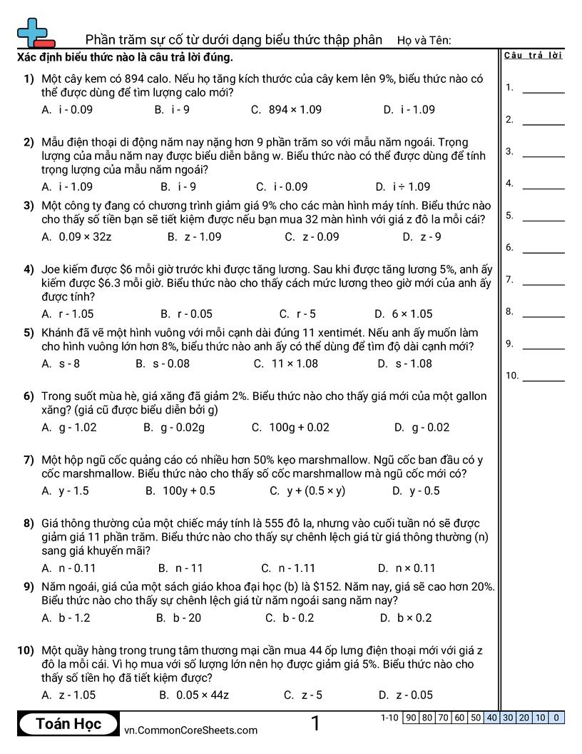 Phiếu bài tập math miễn phí cho Lớp 7 (7ee2) về Phần trăm sự cố từ dưới dạng biểu thức thập phân. Mỗi phiếu có 10 bài tập kèm đáp án và phù hợp cho giáo viên và học tại nhà. Bạn có thể tải PDF, tạo thẻ ghi nhớ hoặc dùng cho học trực tuyến.