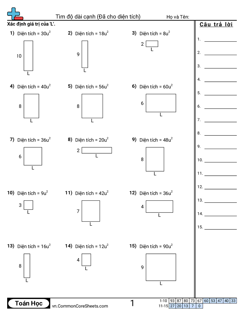 Mỗi bảng gồm 15 câu tìm cạnh chưa biết của một hình chữ nhật, dựa theo diện tích.
