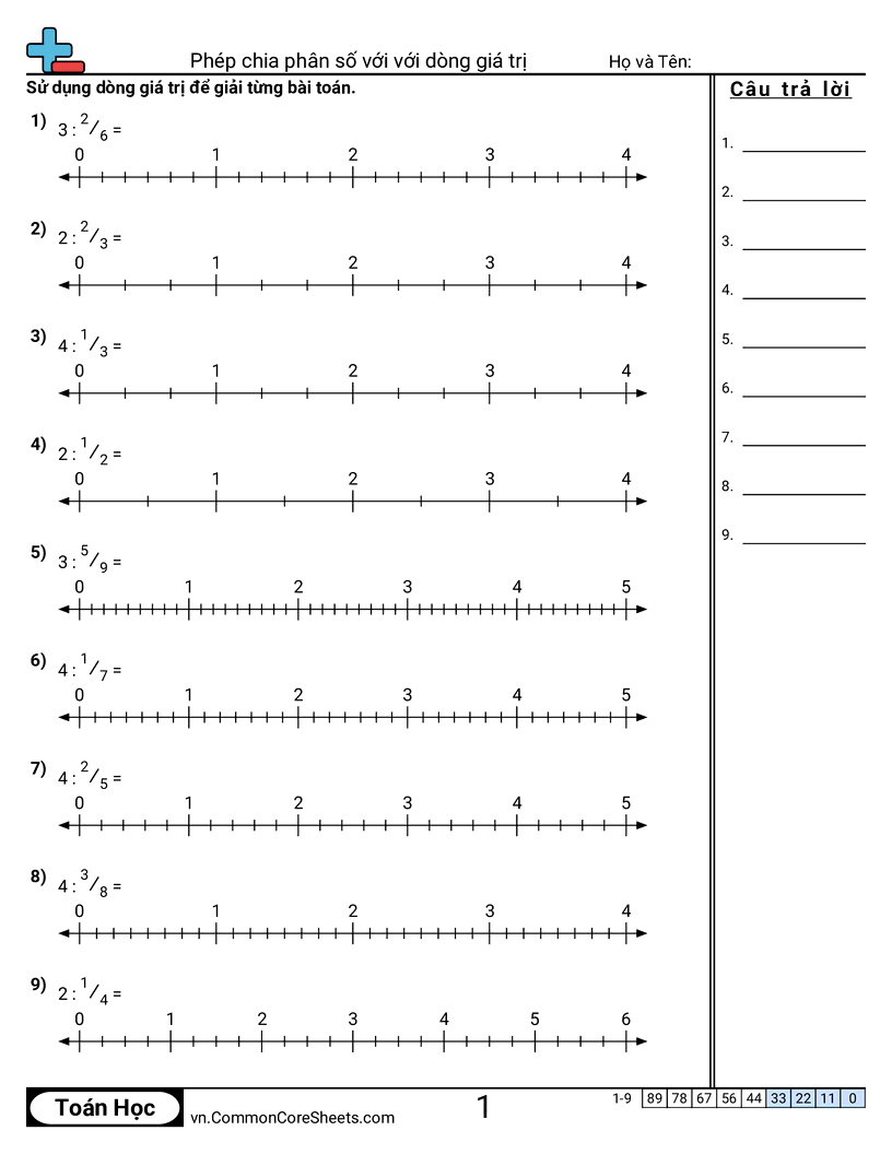Mỗi trang có 9 bài toán sử dụng dòng giá trị để chia các phân số.