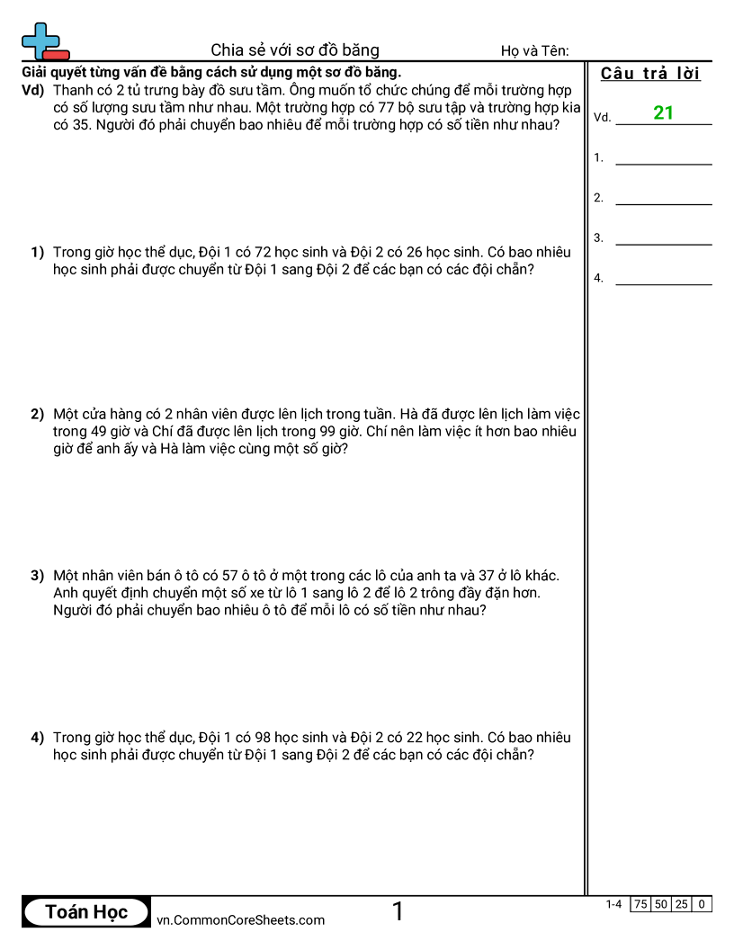 Phiếu bài tập math miễn phí về Chia sẻ với sơ đồ băng. Mỗi phiếu có 4 bài tập kèm đáp án và phù hợp cho giáo viên và học tại nhà. Bạn có thể tải PDF, tạo thẻ ghi nhớ hoặc dùng cho học trực tuyến.