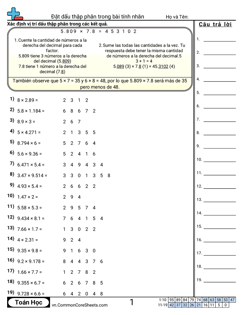 Phiếu bài tập math miễn phí cho Lớp 5 (5nbt7) về Đặt dấu thập phân trong bài tính nhân. Mỗi phiếu có 19 bài tập kèm đáp án và phù hợp cho giáo viên và học tại nhà. Bạn có thể tải PDF, tạo thẻ ghi nhớ hoặc dùng cho học trực tuyến.
