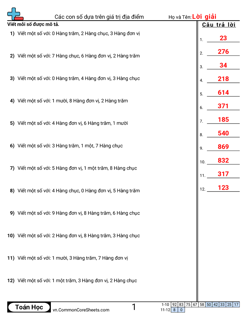 Mỗi trang gồm 12 câu viết một số đựa trên lương ở hàng trăm, hàng chục và hàng đơn vị.