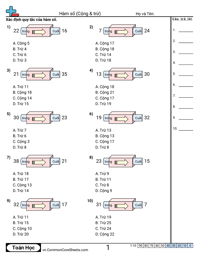 Phiếu bài tập math miễn phí về Hàm số (Cộng & trừ). Mỗi phiếu có 10 bài tập kèm đáp án và phù hợp cho giáo viên và học tại nhà. Bạn có thể tải PDF, tạo thẻ ghi nhớ hoặc dùng cho học trực tuyến.