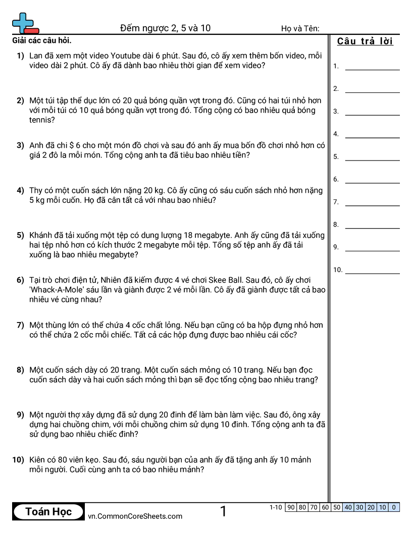 Phiếu bài tập math miễn phí về Đếm ngược 2, 5 và 10. Mỗi phiếu có 10 bài tập kèm đáp án và phù hợp cho giáo viên và học tại nhà. Bạn có thể tải PDF, tạo thẻ ghi nhớ hoặc dùng cho học trực tuyến.