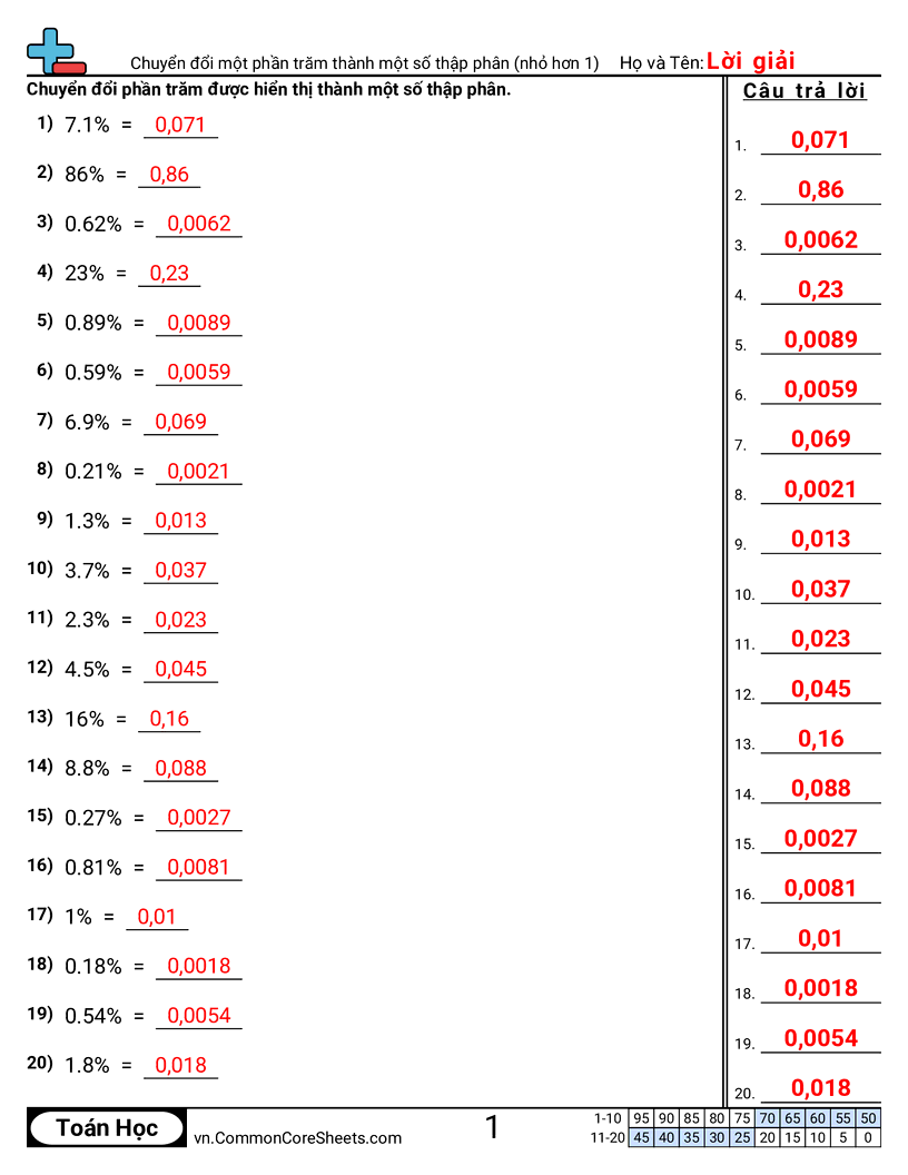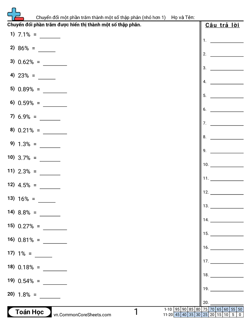 Phiếu bài tập math miễn phí về Chuyển đổi một phần trăm thành một số thập phân (nhỏ hơn 1). Mỗi phiếu có 20 bài tập kèm đáp án và phù hợp cho giáo viên và học tại nhà. Bạn có thể tải PDF, tạo thẻ ghi nhớ hoặc dùng cho học trực tuyến.
