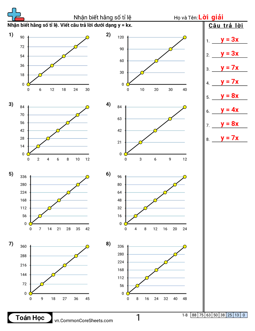 Mỗi trang có 8 câu dùng một đồ thị để nhận dạng của hằng số tỉ lệ.