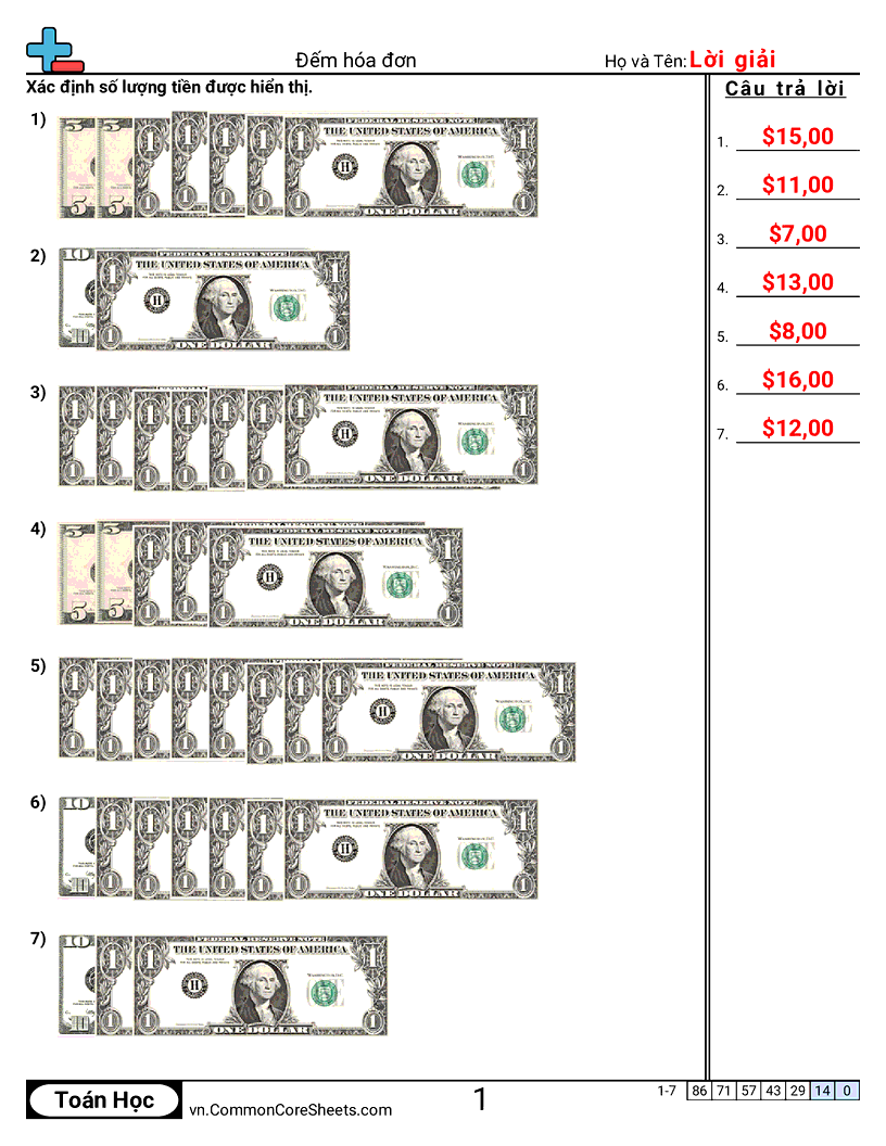 Phiếu bài tập math miễn phí về Đếm hóa đơn. Mỗi phiếu có 7 bài tập kèm đáp án và phù hợp cho giáo viên và học tại nhà. Bạn có thể tải PDF, tạo thẻ ghi nhớ hoặc dùng cho học trực tuyến.