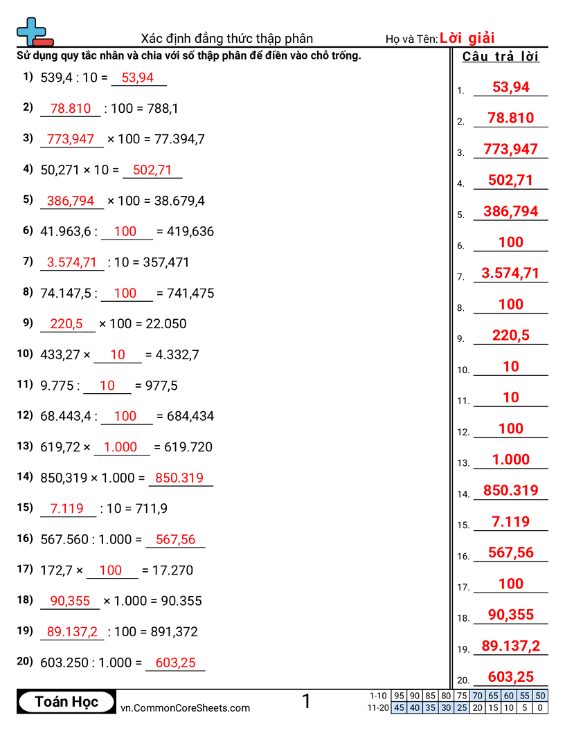 Mỗi bảng có 20 phép tính nhân hay chia một số thập phân với bội số của 10.