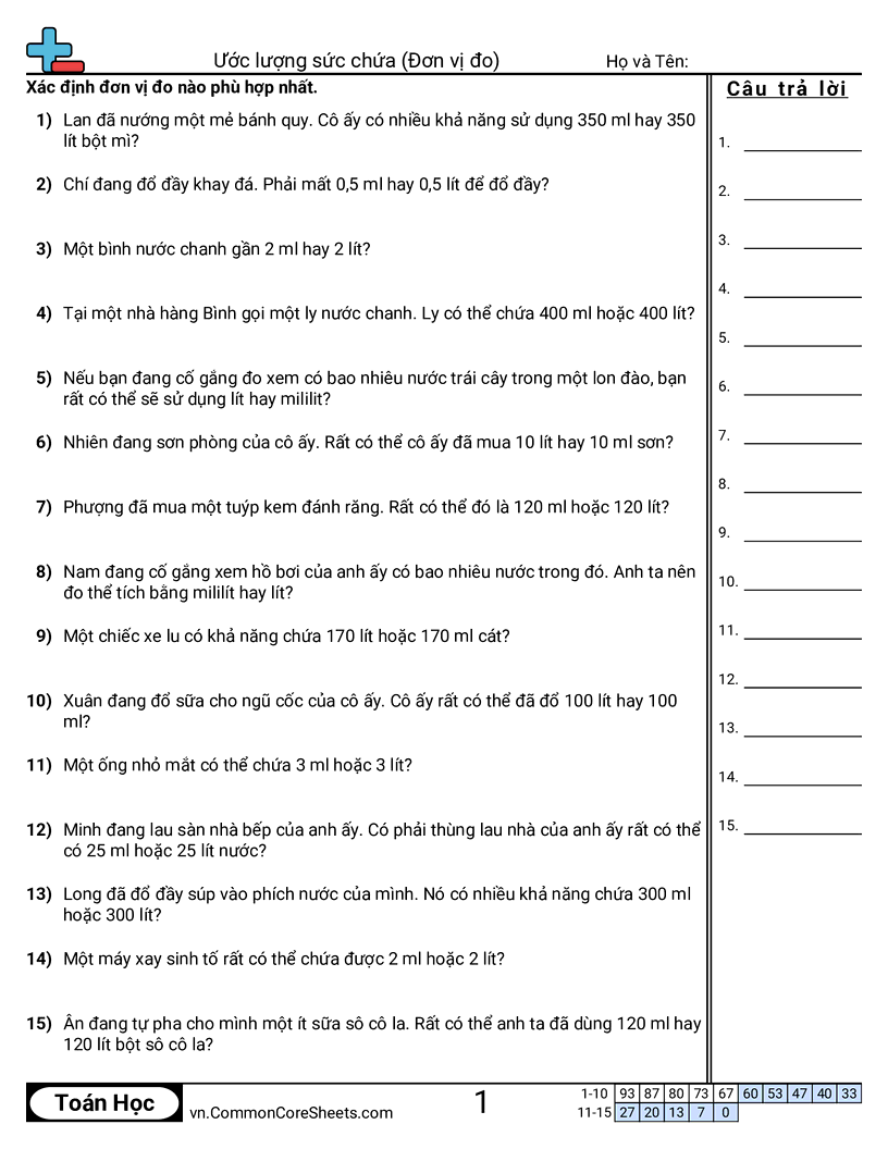 Phiếu bài tập math miễn phí cho Lớp 3 (3md2) về Ước lượng sức chứa (Đơn vị đo) . Mỗi phiếu có 15 bài tập kèm đáp án và phù hợp cho giáo viên và học tại nhà. Bạn có thể tải PDF, tạo thẻ ghi nhớ hoặc dùng cho học trực tuyến.