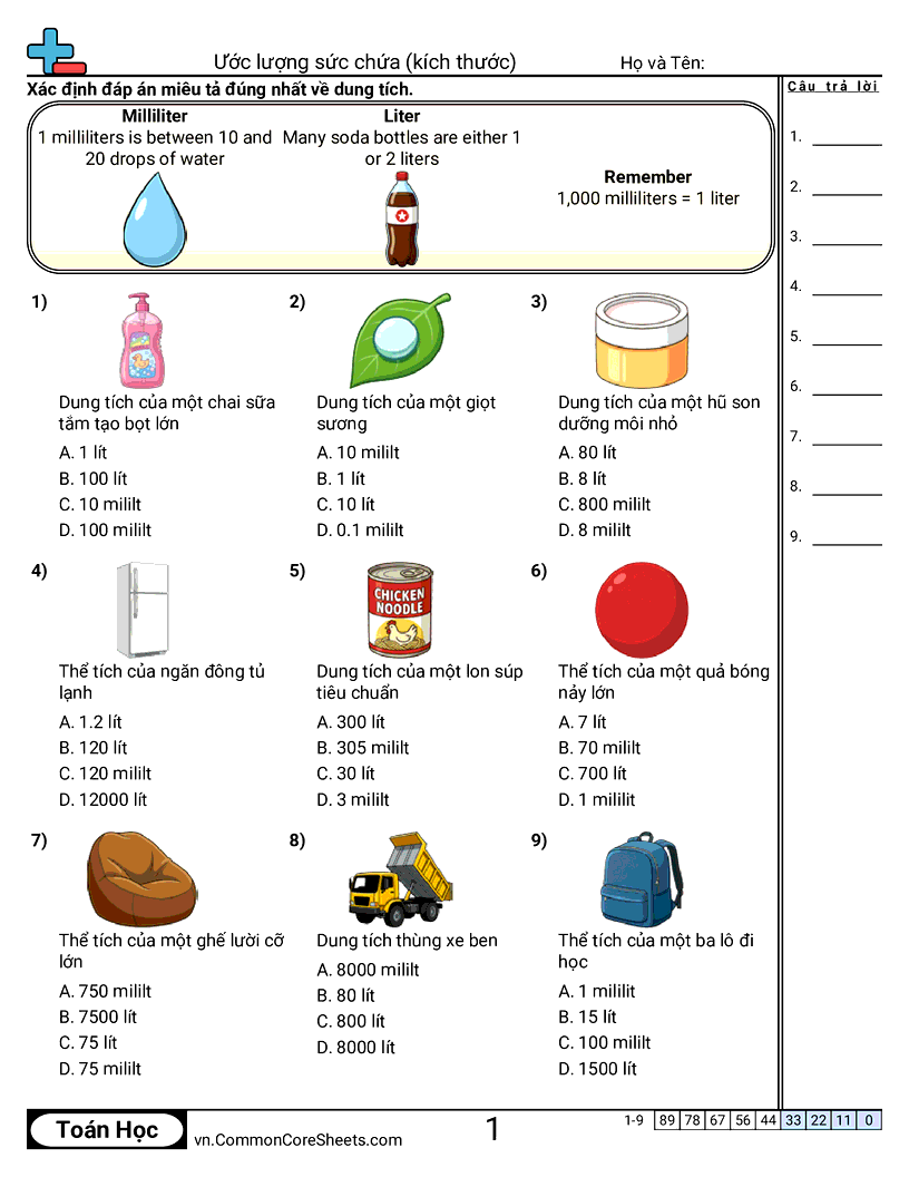 Phiếu bài tập math miễn phí cho Lớp 3 (3md2) về Ước lượng sức chứa (kích thước) . Mỗi phiếu có 9 bài tập kèm đáp án và phù hợp cho giáo viên và học tại nhà. Bạn có thể tải PDF, tạo thẻ ghi nhớ hoặc dùng cho học trực tuyến.