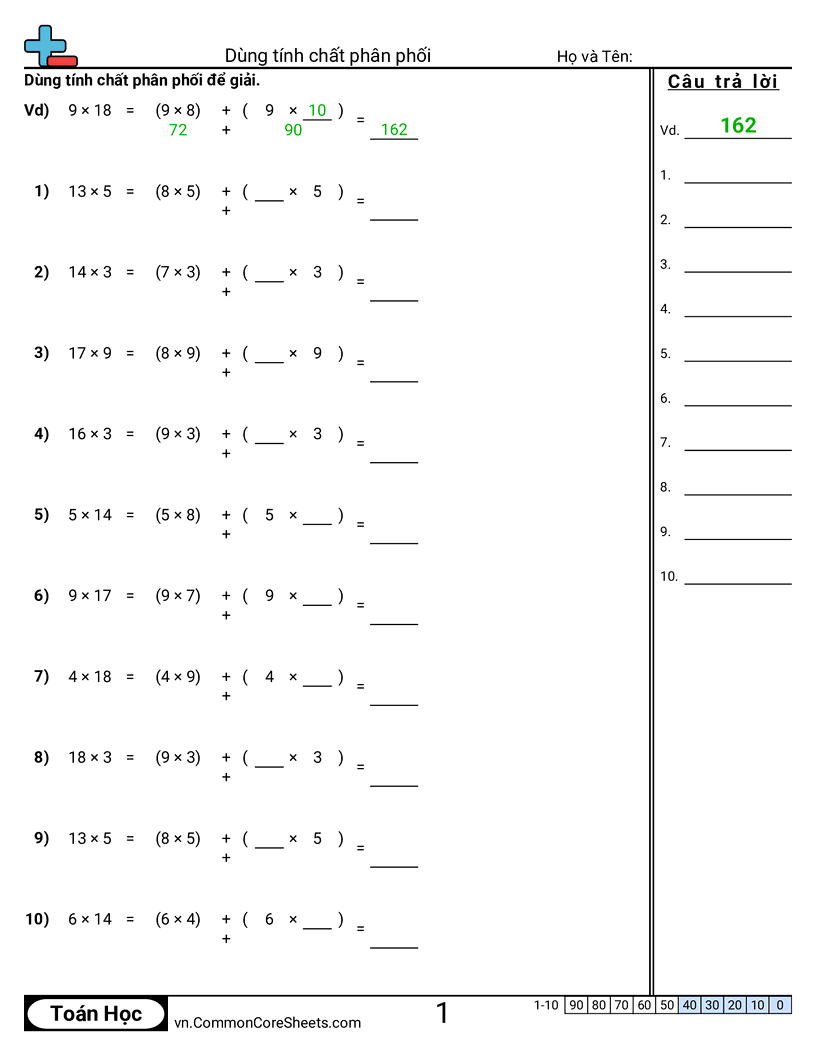Phiếu bài tập math miễn phí cho Lớp 3 (3oa5) về Dùng tính chất phân phối. Mỗi phiếu có 10 bài tập kèm đáp án và phù hợp cho giáo viên và học tại nhà. Bạn có thể tải PDF, tạo thẻ ghi nhớ hoặc dùng cho học trực tuyến.