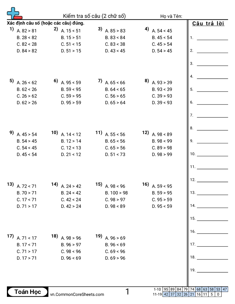 Phiếu bài tập math miễn phí về Kiểm tra số câu (2 chữ số) . Mỗi phiếu có 19 bài tập kèm đáp án và phù hợp cho giáo viên và học tại nhà. Bạn có thể tải PDF, tạo thẻ ghi nhớ hoặc dùng cho học trực tuyến.