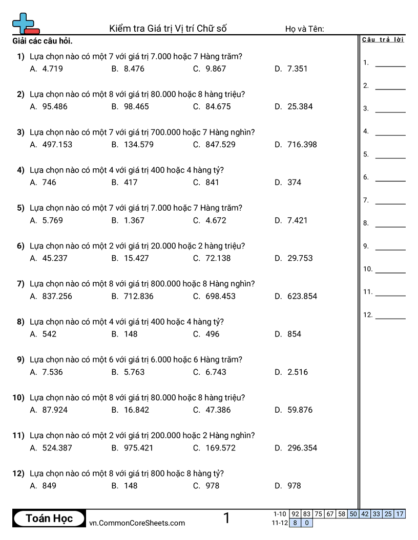 Phiếu bài tập math miễn phí về Kiểm tra Giá trị Vị trí Chữ số. Mỗi phiếu có 12 bài tập kèm đáp án và phù hợp cho giáo viên và học tại nhà. Bạn có thể tải PDF, tạo thẻ ghi nhớ hoặc dùng cho học trực tuyến.