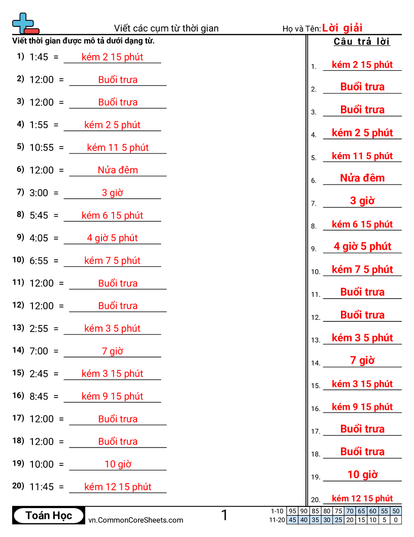 Phiếu bài tập math miễn phí về Viết các cụm từ thời gian. Mỗi phiếu có 20 bài tập kèm đáp án và phù hợp cho giáo viên và học tại nhà. Bạn có thể tải PDF, tạo thẻ ghi nhớ hoặc dùng cho học trực tuyến.