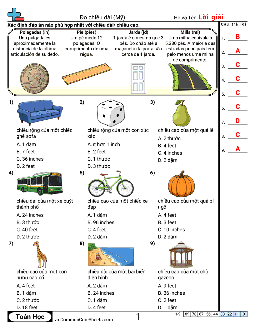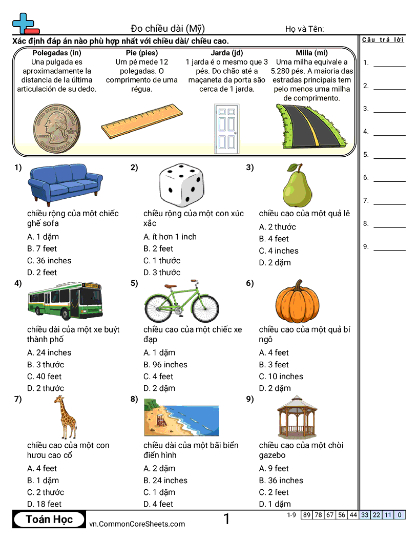 Phiếu bài tập math miễn phí cho Lớp 4 (4md1) về Đo chiều dài (Mỹ). Mỗi phiếu có 9 bài tập kèm đáp án và phù hợp cho giáo viên và học tại nhà. Bạn có thể tải PDF, tạo thẻ ghi nhớ hoặc dùng cho học trực tuyến.