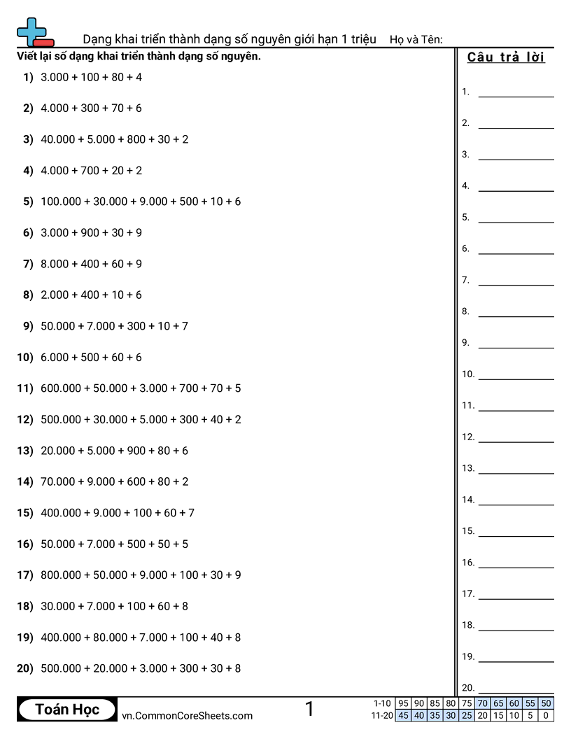 Mỗi bảng có 20 câu đổi từ dạng khai triển thành dạng số nguyên.