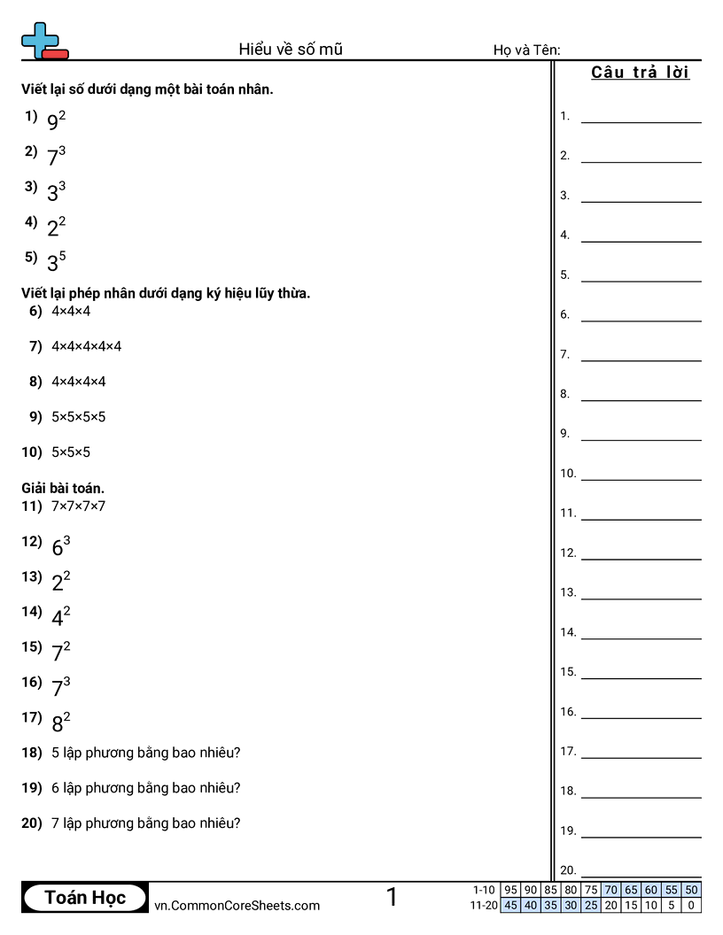 Mỗi trang có 20 câu giới thiệu về số mũ.