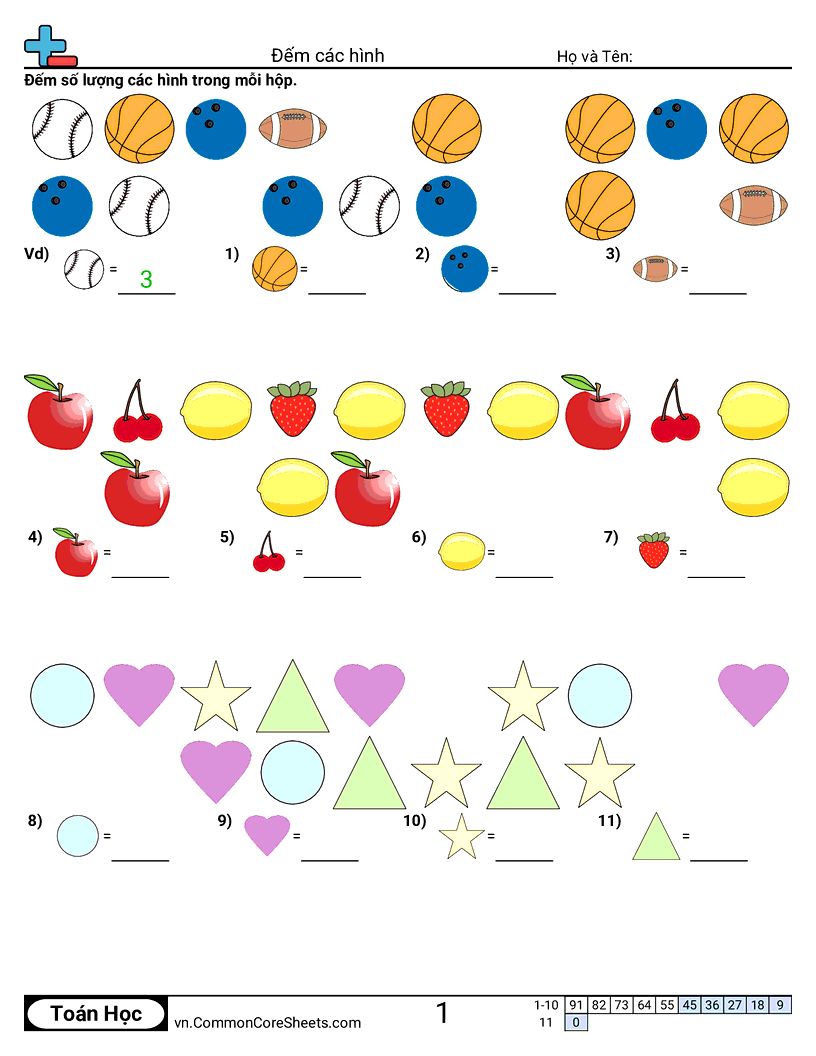 Phiếu bài tập math miễn phí cho Mẫu giáo (kcc5) về Đếm các hình. Mỗi phiếu có 11 bài tập kèm đáp án và phù hợp cho giáo viên và học tại nhà. Bạn có thể tải PDF, tạo thẻ ghi nhớ hoặc dùng cho học trực tuyến.
