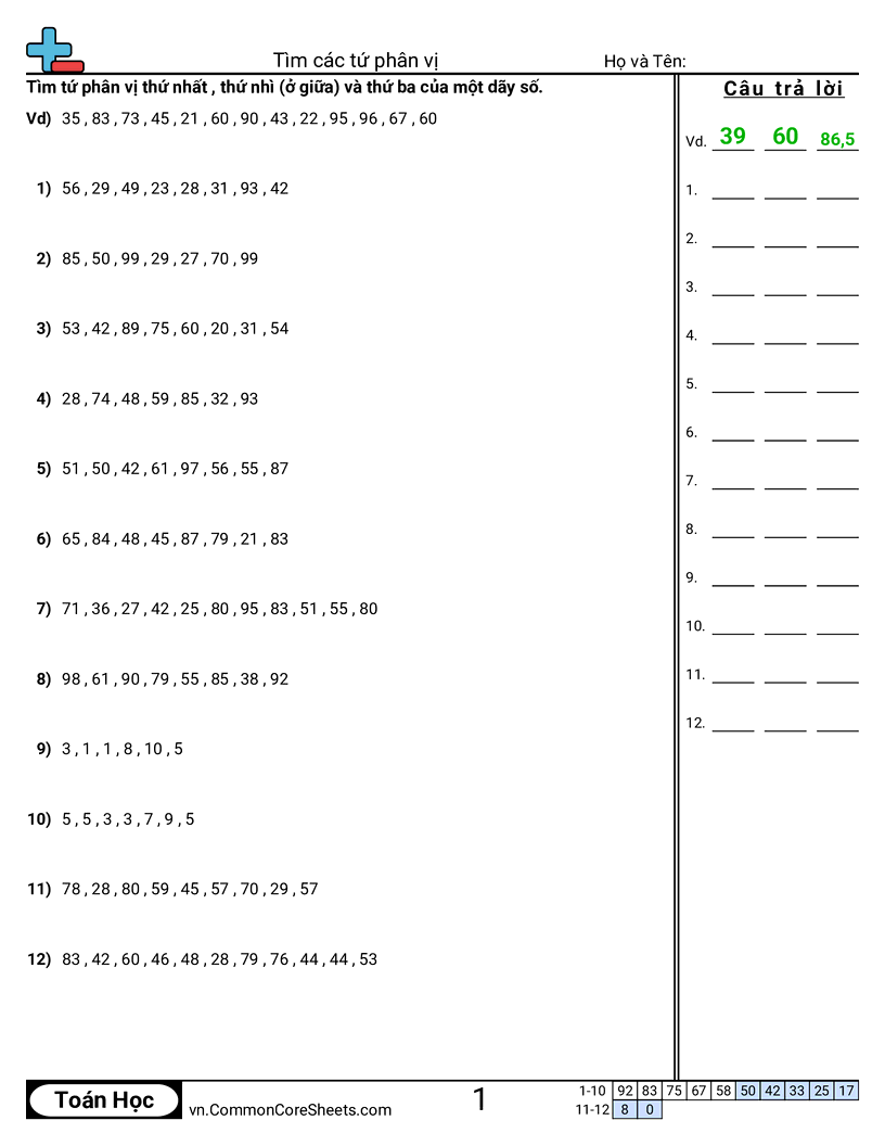 Mỗi bảng có 12 câu chia một dãy số thành tứ phân vị.