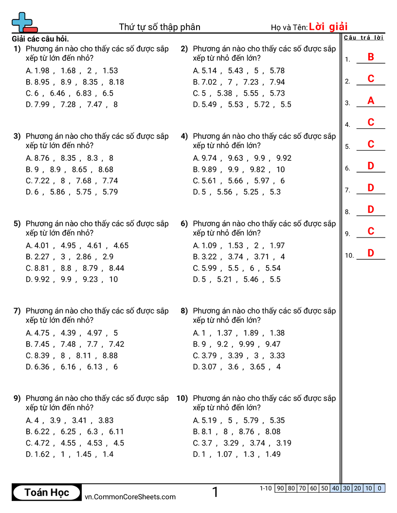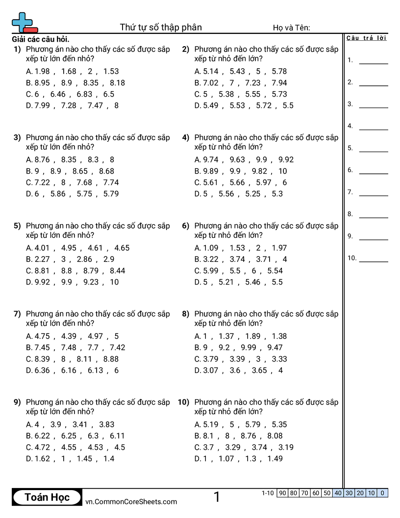 Phiếu bài tập math miễn phí cho Lớp 4 (4nf7) về Thứ tự số thập phân. Mỗi phiếu có 10 bài tập kèm đáp án và phù hợp cho giáo viên và học tại nhà. Bạn có thể tải PDF, tạo thẻ ghi nhớ hoặc dùng cho học trực tuyến.