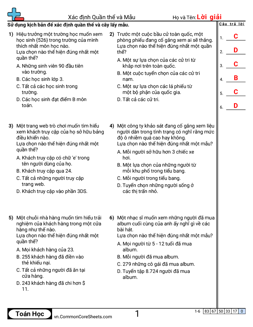 Phiếu bài tập math miễn phí cho Lớp 7 (7sp1) về Xác định Quần thể và Mẫu. Mỗi phiếu có 6 bài tập kèm đáp án và phù hợp cho giáo viên và học tại nhà. Bạn có thể tải PDF, tạo thẻ ghi nhớ hoặc dùng cho học trực tuyến.
