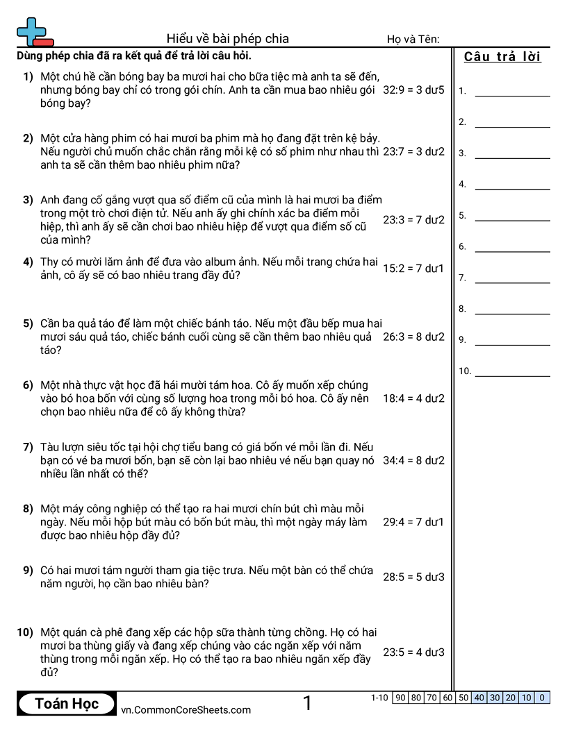 Phiếu bài tập math miễn phí cho Lớp 4 (4oa3) về Hiểu về bài phép chia. Mỗi phiếu có 10 bài tập kèm đáp án và phù hợp cho giáo viên và học tại nhà. Bạn có thể tải PDF, tạo thẻ ghi nhớ hoặc dùng cho học trực tuyến.