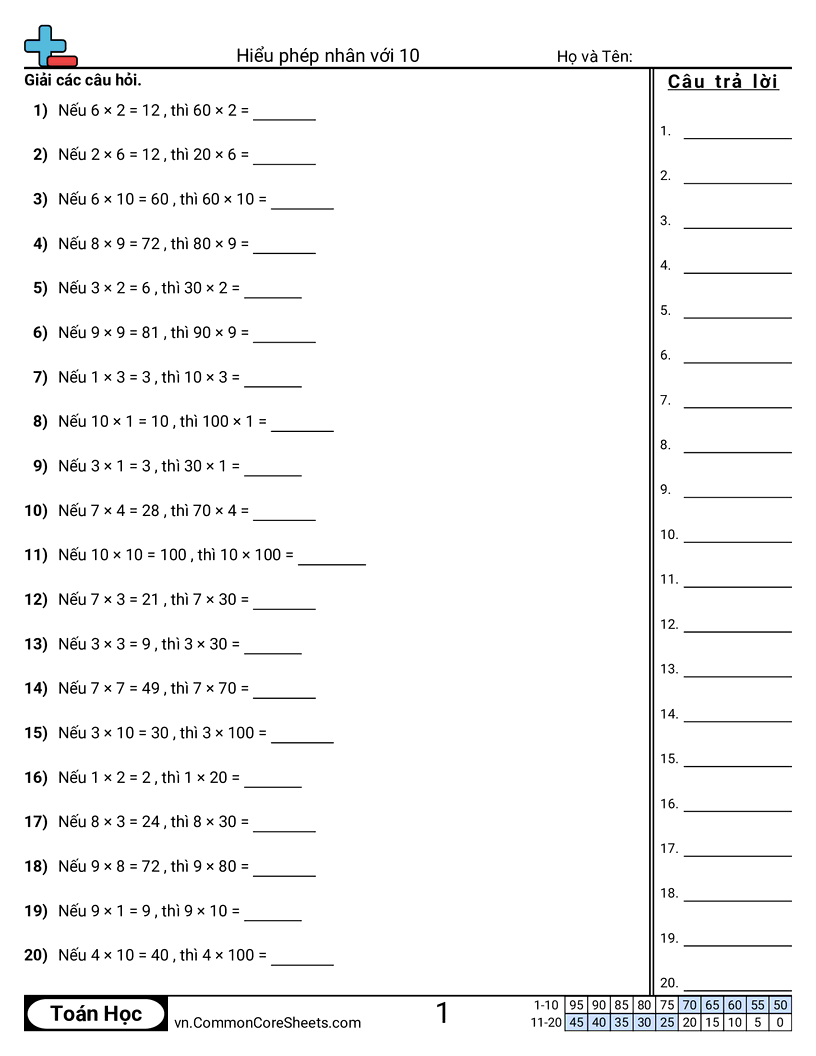 Phiếu bài tập math miễn phí cho Lớp 3 (3oa1) về Hiểu phép nhân với 10. Mỗi phiếu có 20 bài tập kèm đáp án và phù hợp cho giáo viên và học tại nhà. Bạn có thể tải PDF, tạo thẻ ghi nhớ hoặc dùng cho học trực tuyến.