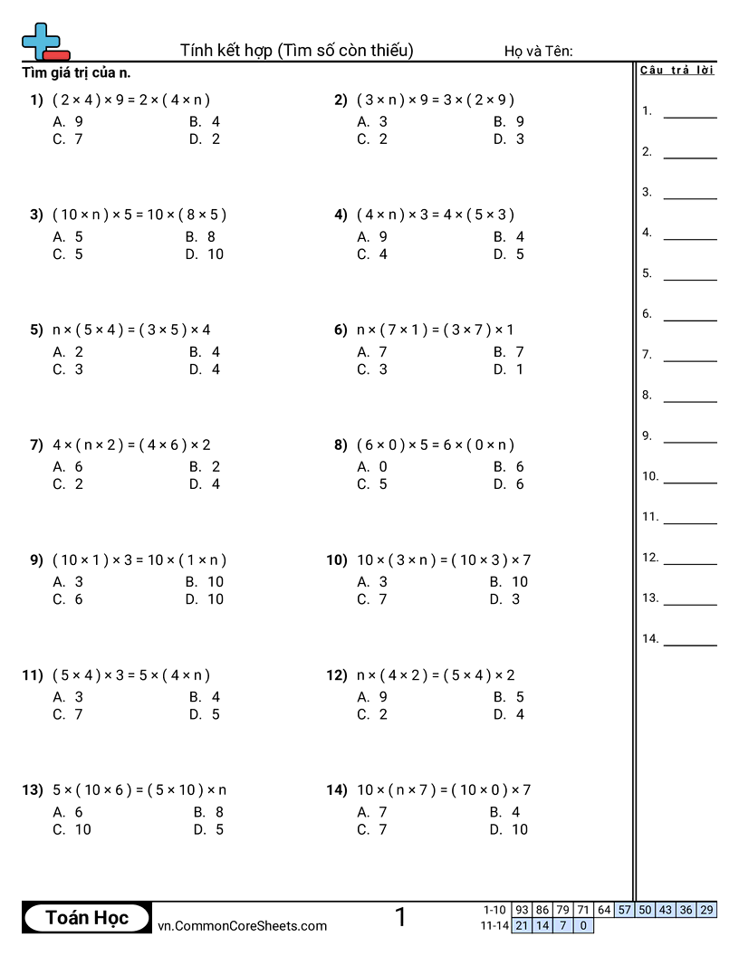 Phiếu bài tập math miễn phí cho Lớp 3 (3oa5) về Tính kết hợp (Tìm số còn thiếu). Mỗi phiếu có 14 bài tập kèm đáp án và phù hợp cho giáo viên và học tại nhà. Bạn có thể tải PDF, tạo thẻ ghi nhớ hoặc dùng cho học trực tuyến.