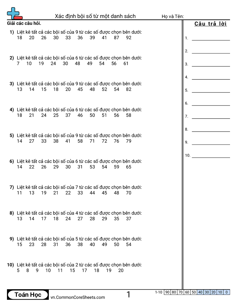 Phiếu bài tập math miễn phí cho Lớp 4 (4oa4) về Xác định bội số từ một danh sách. Mỗi phiếu có 10 bài tập kèm đáp án và phù hợp cho giáo viên và học tại nhà. Bạn có thể tải PDF, tạo thẻ ghi nhớ hoặc dùng cho học trực tuyến.