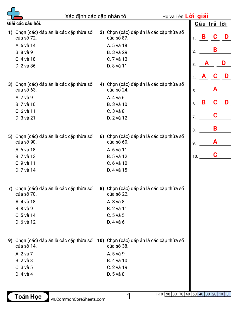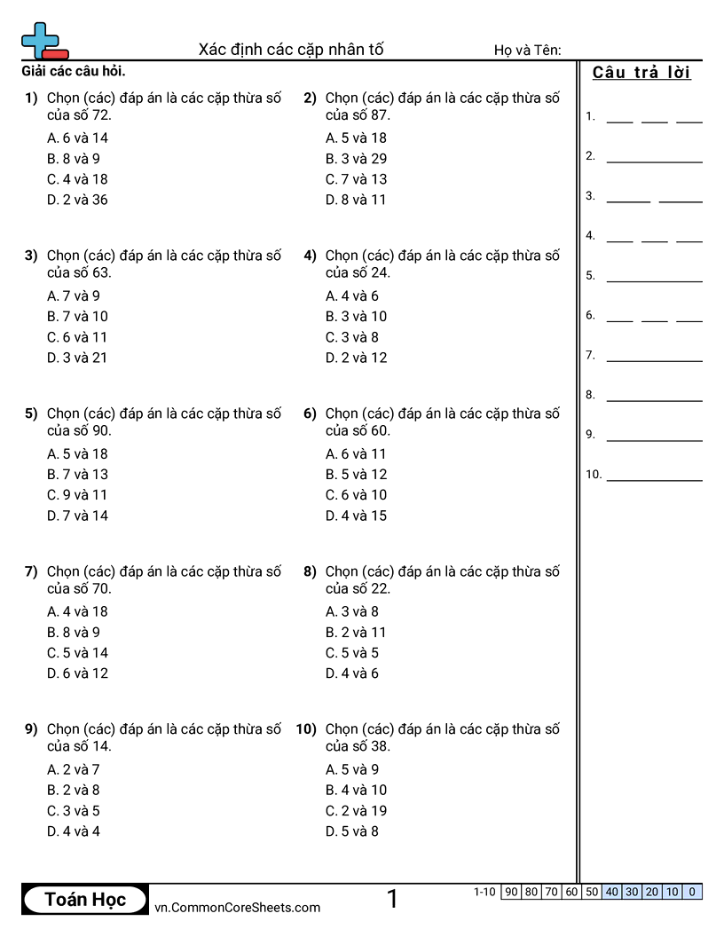 Phiếu bài tập math miễn phí cho Lớp 4 (4oa4) về Xác định các cặp nhân tố. Mỗi phiếu có 10 bài tập kèm đáp án và phù hợp cho giáo viên và học tại nhà. Bạn có thể tải PDF, tạo thẻ ghi nhớ hoặc dùng cho học trực tuyến.