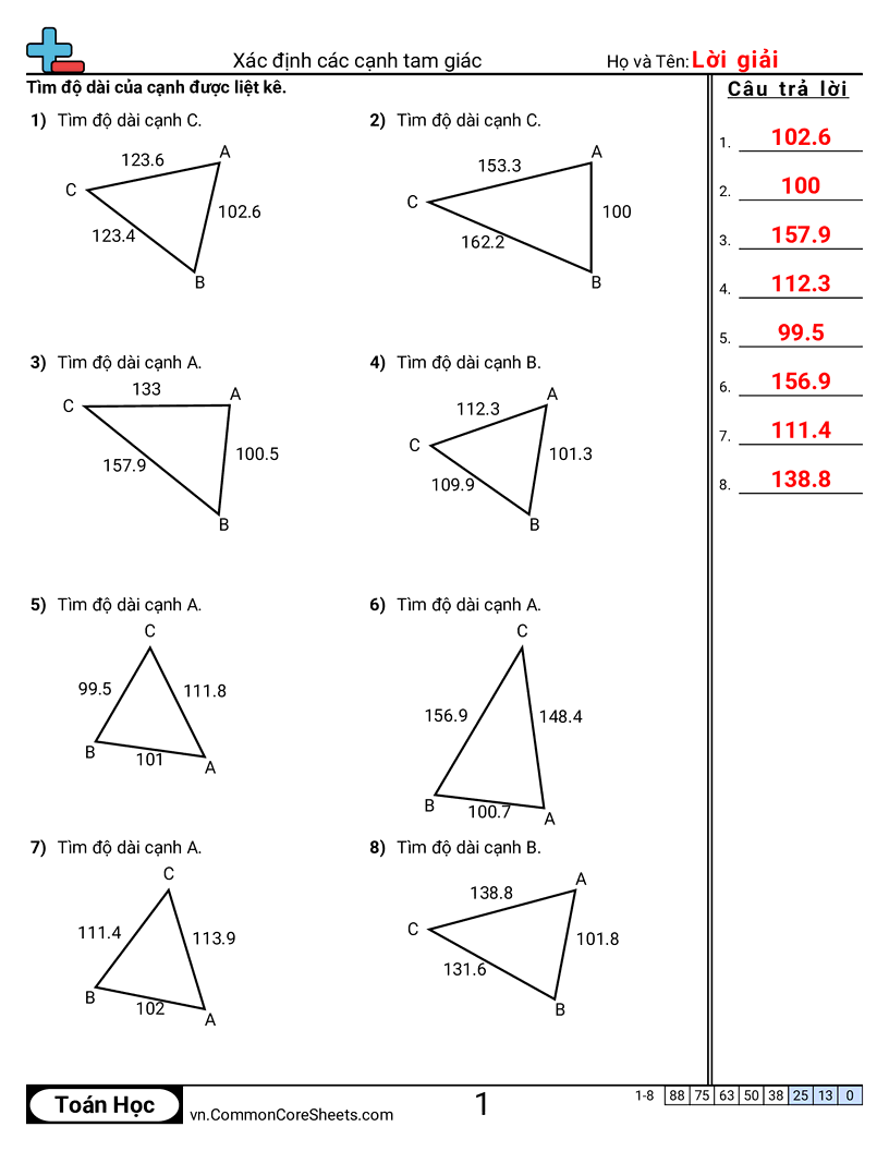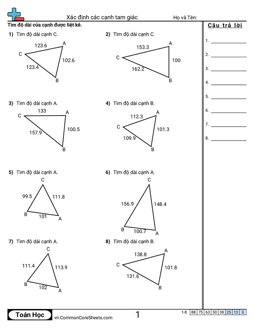 Phiếu bài tập math miễn phí về Xác định các cạnh tam giác. Mỗi phiếu có 8 bài tập kèm đáp án và phù hợp cho giáo viên và học tại nhà. Bạn có thể tải PDF, tạo thẻ ghi nhớ hoặc dùng cho học trực tuyến.