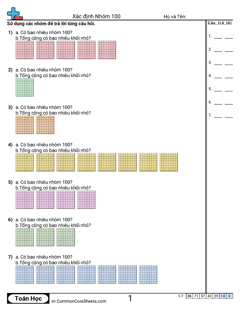 Mỗi trang có 14 câu nhận dạng số nhóm và giá trị của nhóm.