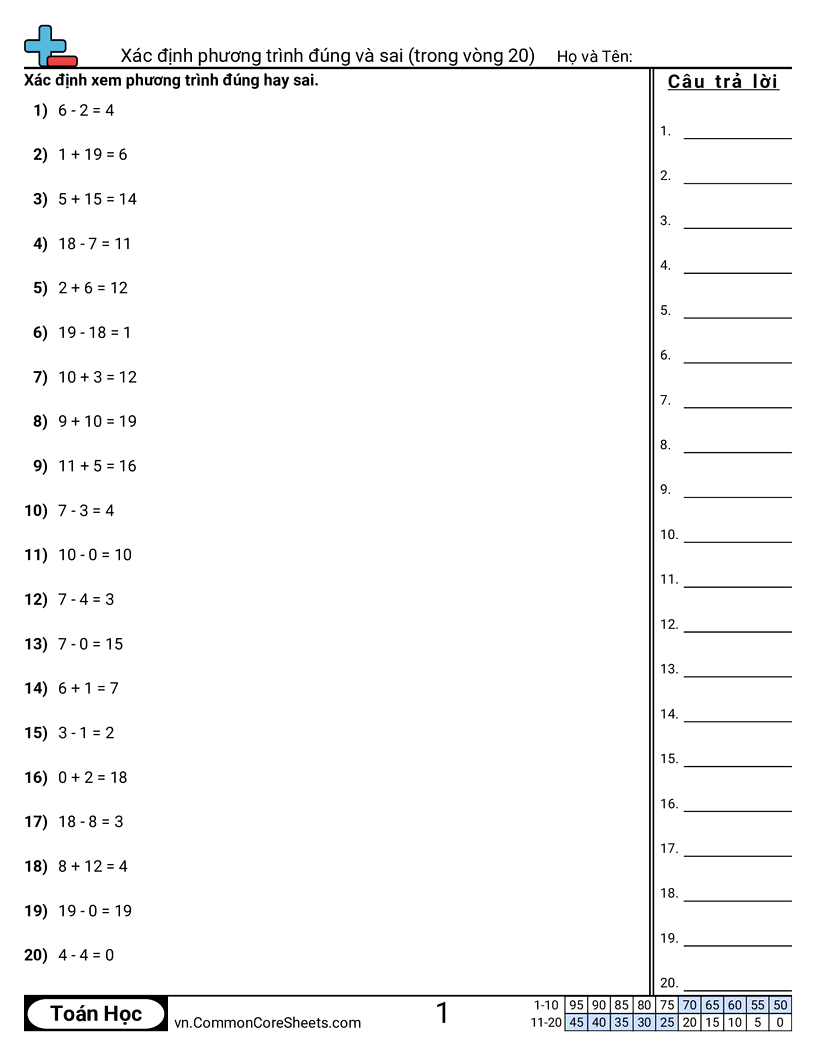 Xác định phương trình đúng và sai (trong phạm vi 20)