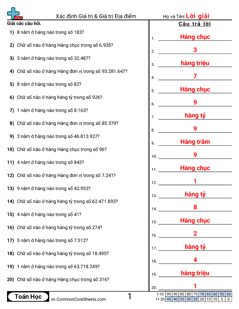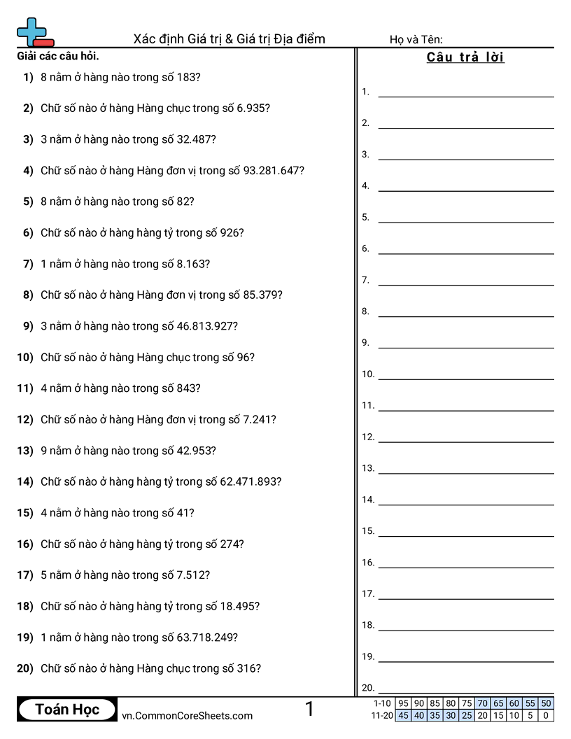 Mỗi trang có 20 câu xác định giá trị và vị trí của một số (lên đến 1 triệu).