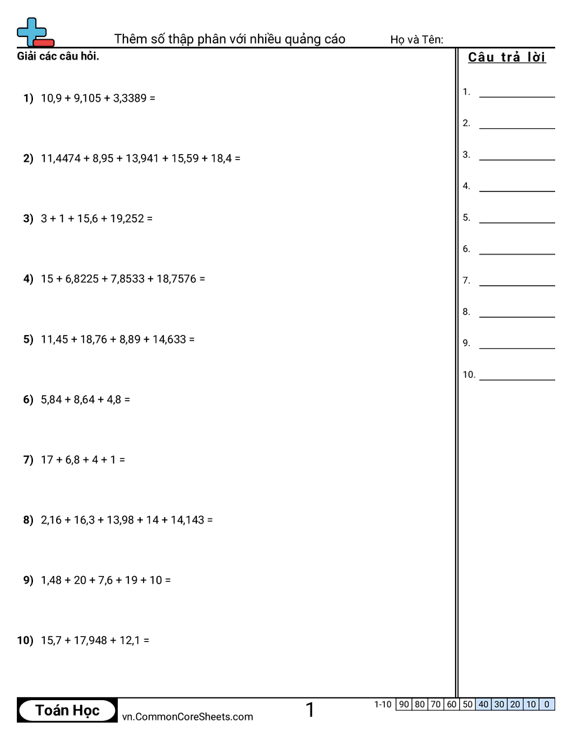 Phiếu bài tập math miễn phí cho Lớp 5 (5nbt7) về Thêm số thập phân với nhiều quảng cáo. Mỗi phiếu có 10 bài tập kèm đáp án và phù hợp cho giáo viên và học tại nhà. Bạn có thể tải PDF, tạo thẻ ghi nhớ hoặc dùng cho học trực tuyến.