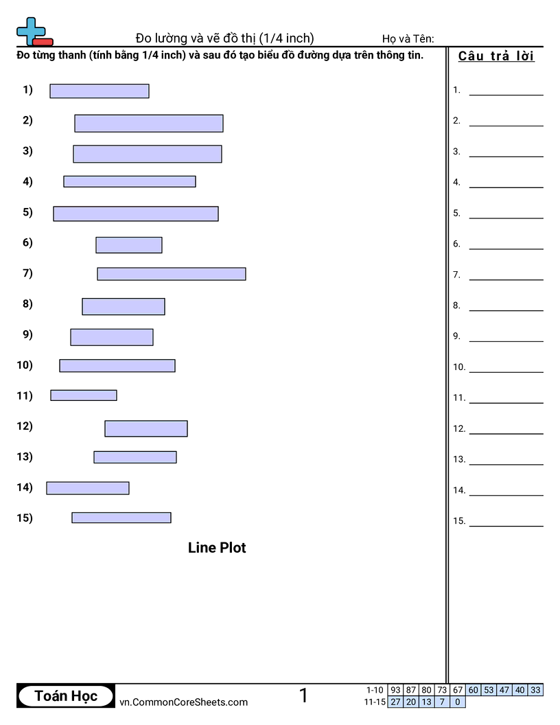 Phiếu bài tập math miễn phí về Đo lường và vẽ đồ thị (1/4 inch). Mỗi phiếu có 15 bài tập kèm đáp án và phù hợp cho giáo viên và học tại nhà. Bạn có thể tải PDF, tạo thẻ ghi nhớ hoặc dùng cho học trực tuyến.