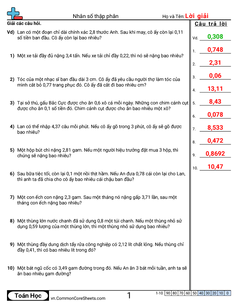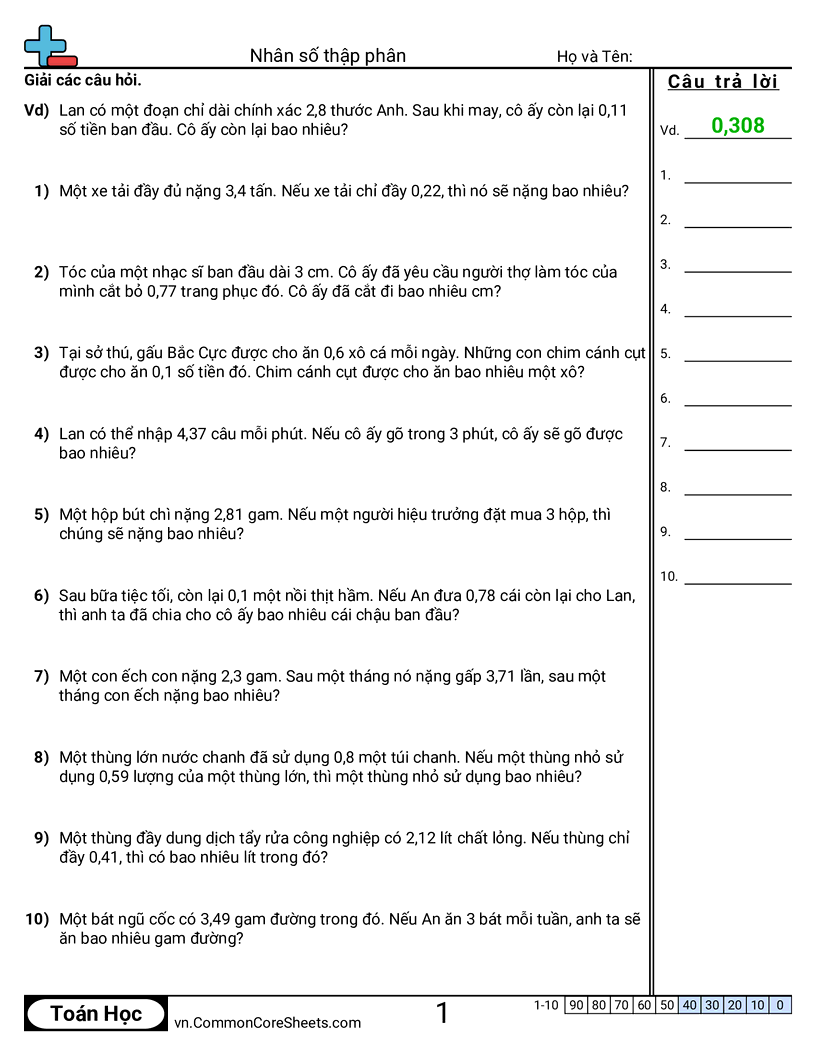 Phiếu bài tập math miễn phí về Nhân số thập phân. Mỗi phiếu có 10 bài tập kèm đáp án và phù hợp cho giáo viên và học tại nhà. Bạn có thể tải PDF, tạo thẻ ghi nhớ hoặc dùng cho học trực tuyến.