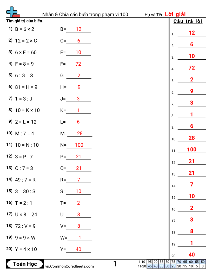 Phiếu bài tập math miễn phí cho Lớp 3 (3oa7) về Nhân & Chia các biến trong phạm vi 100 . Mỗi phiếu có 20 bài tập kèm đáp án và phù hợp cho giáo viên và học tại nhà. Bạn có thể tải PDF, tạo thẻ ghi nhớ hoặc dùng cho học trực tuyến.