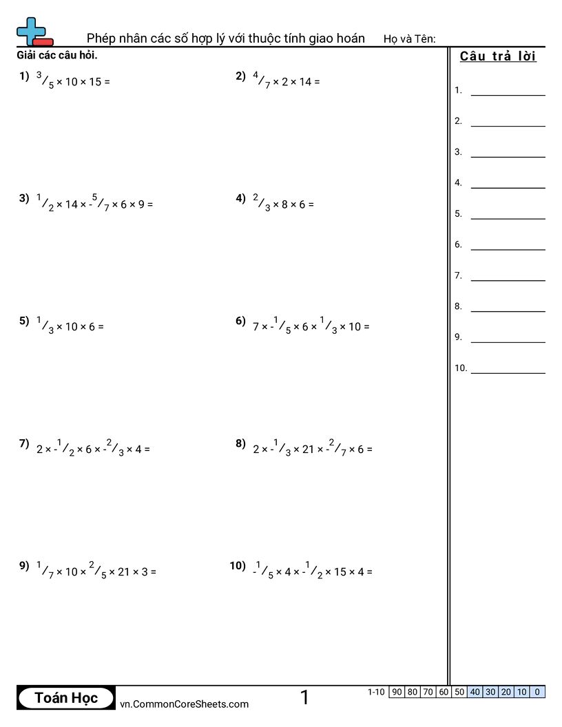 Phiếu bài tập math miễn phí cho Lớp 7 (7ns2c) về Phép nhân các số hợp lý với thuộc tính giao hoán. Mỗi phiếu có 10 bài tập kèm đáp án và phù hợp cho giáo viên và học tại nhà. Bạn có thể tải PDF, tạo thẻ ghi nhớ hoặc dùng cho học trực tuyến.