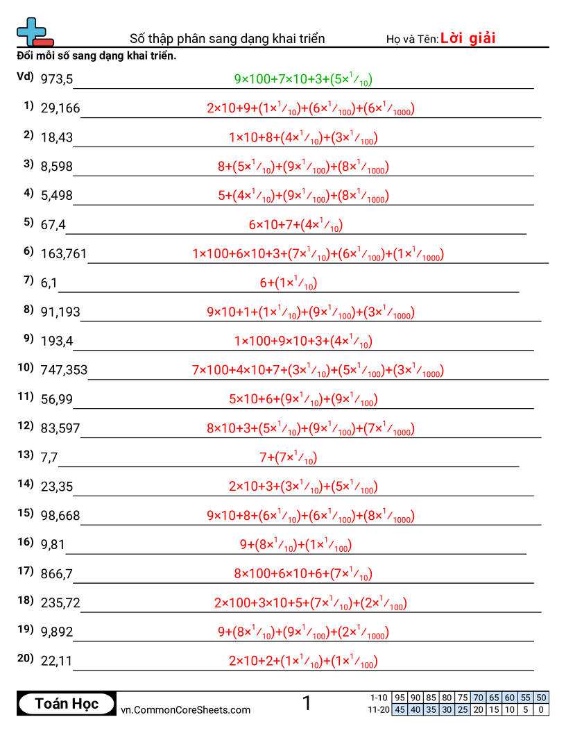 Mỗi bảng có 20 câu đổi từ số thập phân (sau dấu thập phân có 3 chữ số) sang dạng khai triển.