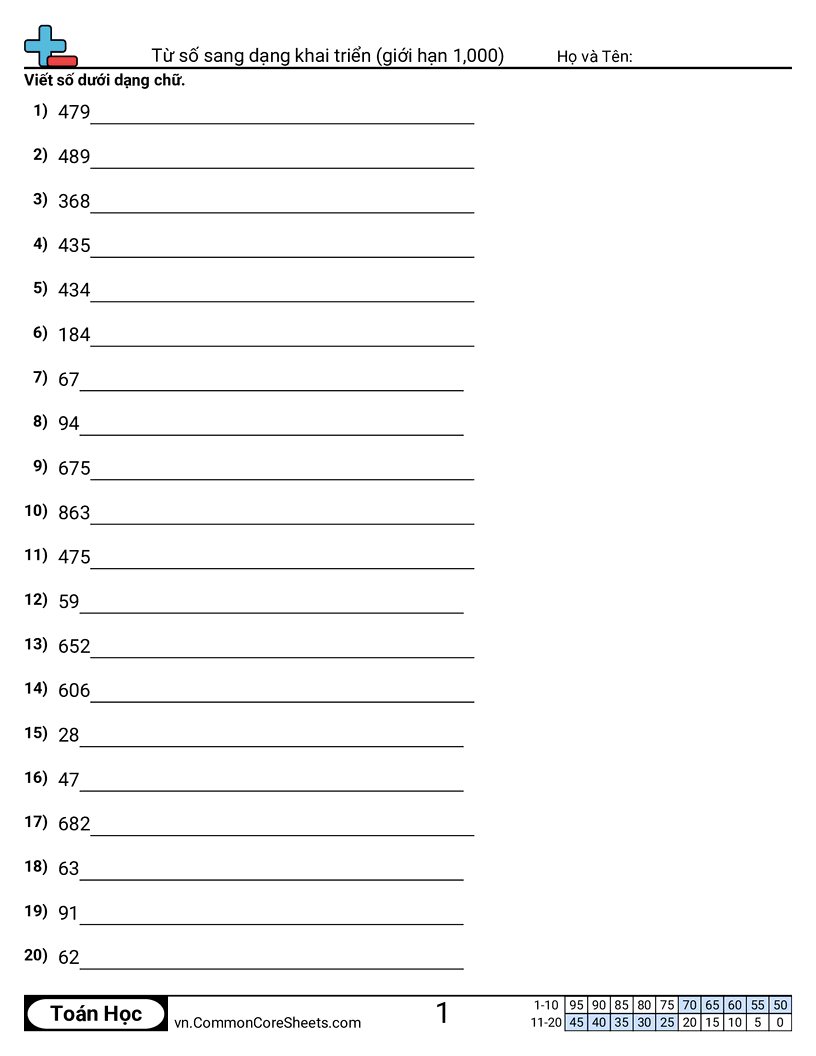 Mỗi bảng có 20 câu đổi từ dạng số sang dạng khai triển bằng chữ.