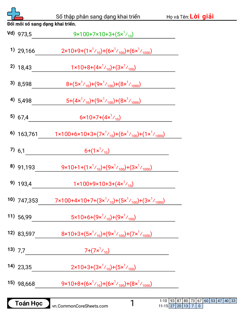 Mỗi bảng có 20 câu đổi từ số thập phân (sau dấu thập phân có 3 chữ số) sang dạng khai triển.