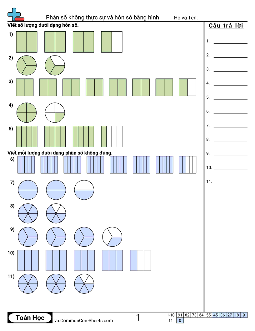 Phiếu bài tập math miễn phí về Phân số không thực sự và hỗn số bằng hình. Mỗi phiếu có 11 bài tập kèm đáp án và phù hợp cho giáo viên và học tại nhà. Bạn có thể tải PDF, tạo thẻ ghi nhớ hoặc dùng cho học trực tuyến.