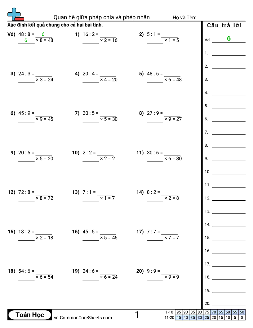 Mỗi bảng có 20 bài về quan hệ giữa pháp chia và phép nhân.