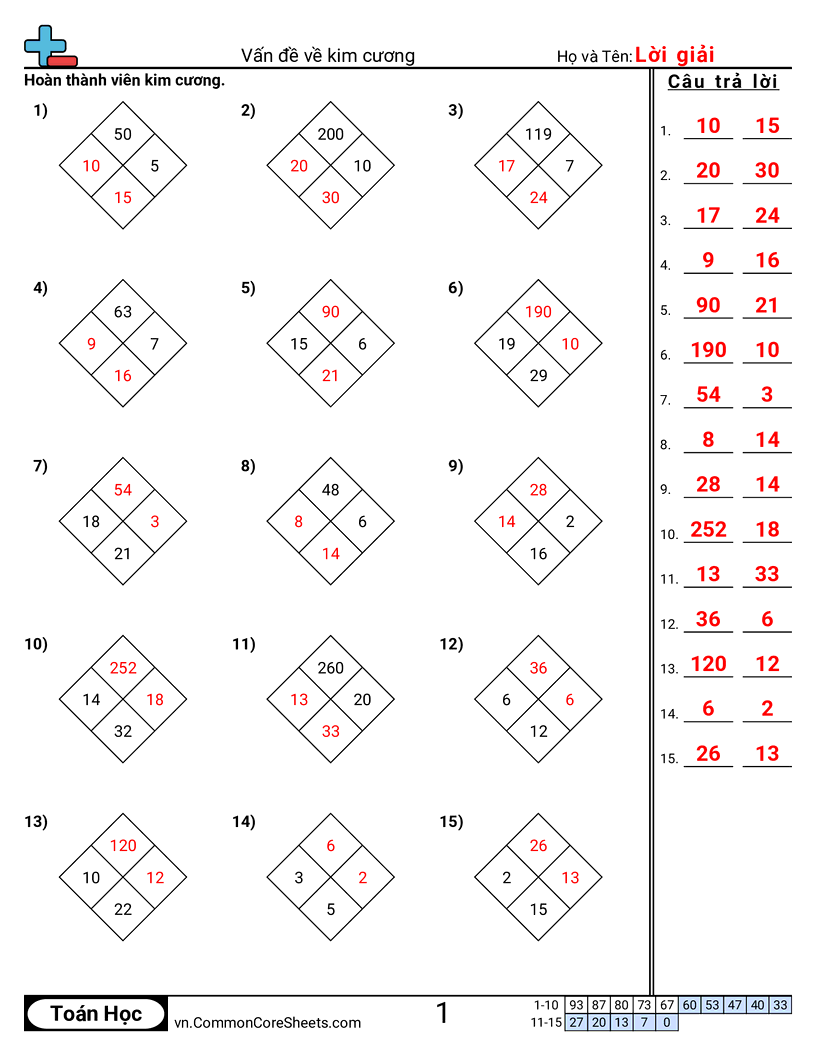 Phiếu bài tập math miễn phí về Vấn đề về kim cương. Mỗi phiếu có 15 bài tập kèm đáp án và phù hợp cho giáo viên và học tại nhà. Bạn có thể tải PDF, tạo thẻ ghi nhớ hoặc dùng cho học trực tuyến.